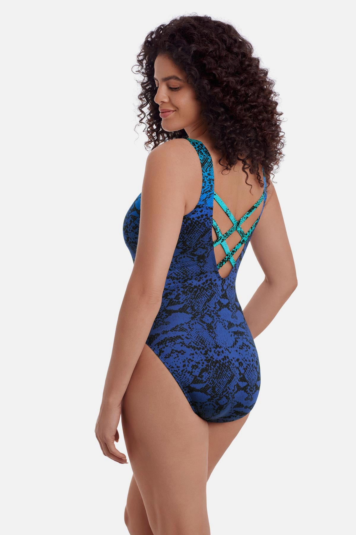 Featured in Ombre Queen, a gradient snakeskin print that transitions from deep indigo to ocean blue.