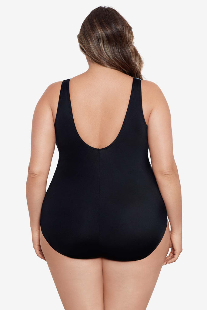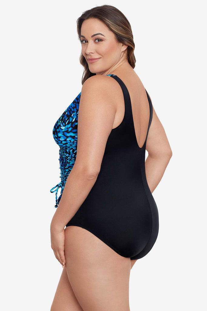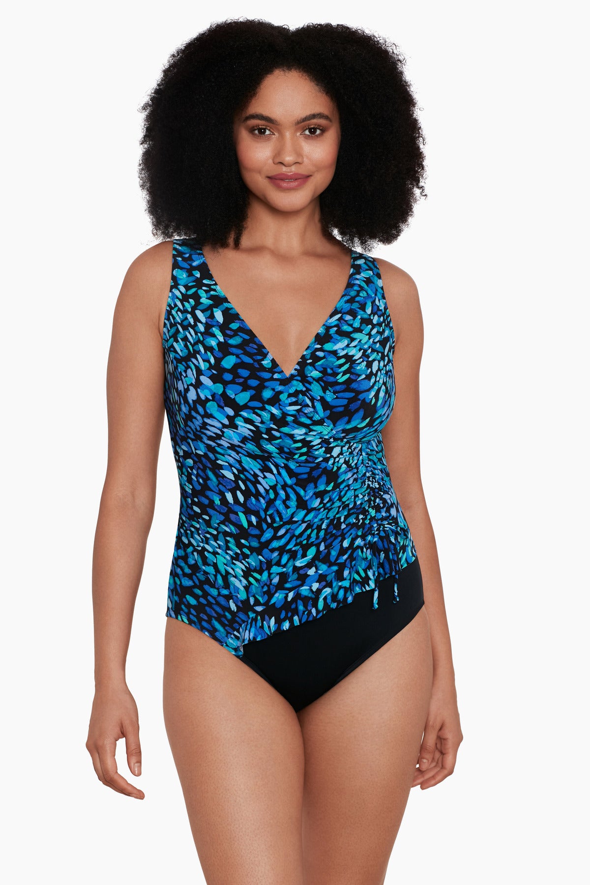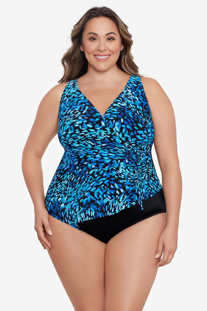 The Inner firming shapewear in the Longitude Petals Apart Ruffle Surplice Long Torso One Piece Swimsuit offers all day comfort while a colorful blue print graces this ageless swimwear style. A longer length and finer fit enhance all figures, embracing confidence within.